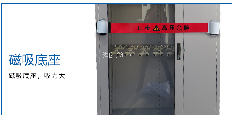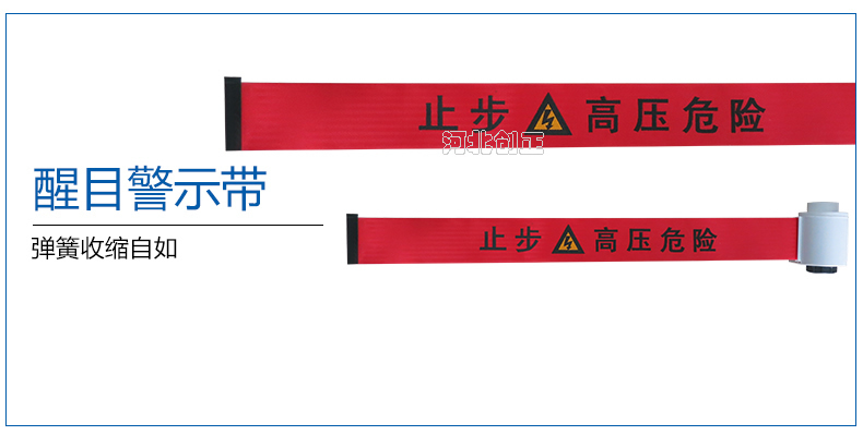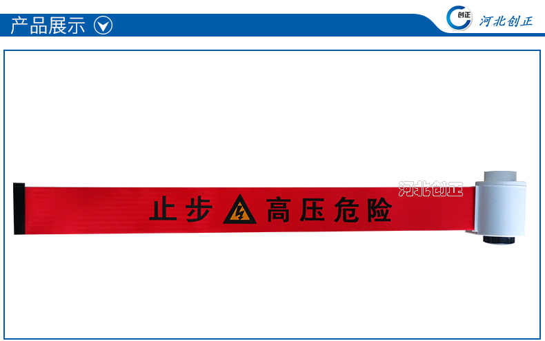 警示帶盒是ABS材料制成;帶是錦綸材質,上面印有閃電符號,止步,高壓危險等字樣。