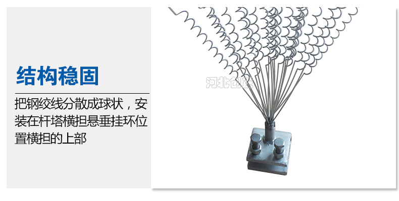 3、打開后呈半球狀,中間有一根直刺,阻止鳥類從上往下降落,下面是短刺,阻止鳥類在橫擔縫隙行走或棲息。安裝后能收起,不影響人員工作。