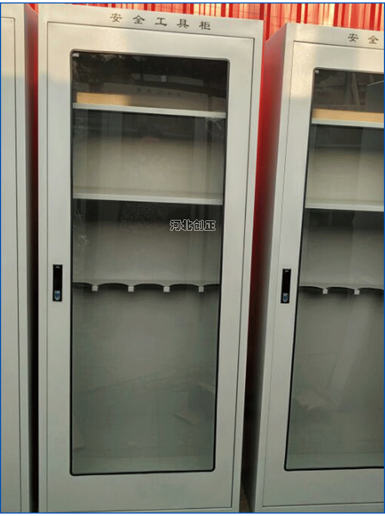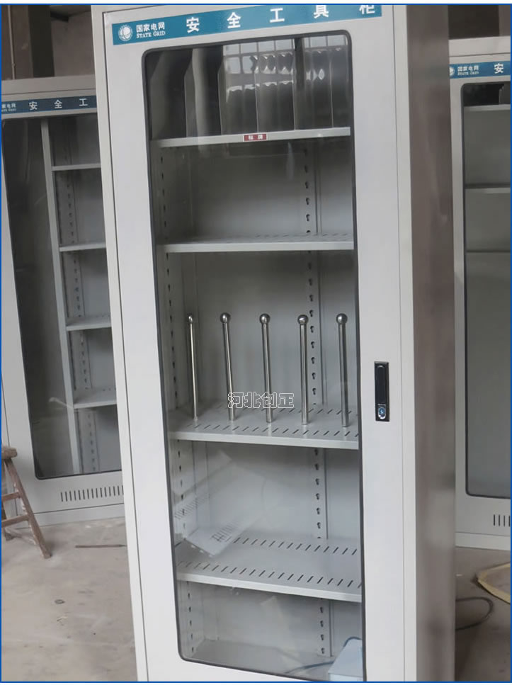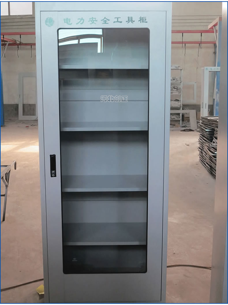 1、柜體是冷軋鋼板卷壓成型,厚度有1.0mm,1.2mm1.5mm供選擇。柜體表面采用靜電防腐噴塑工藝,顏色為駝灰色,柜門裝有通體透明鋼化玻璃,透過玻璃可以看到分類有序的工器具。