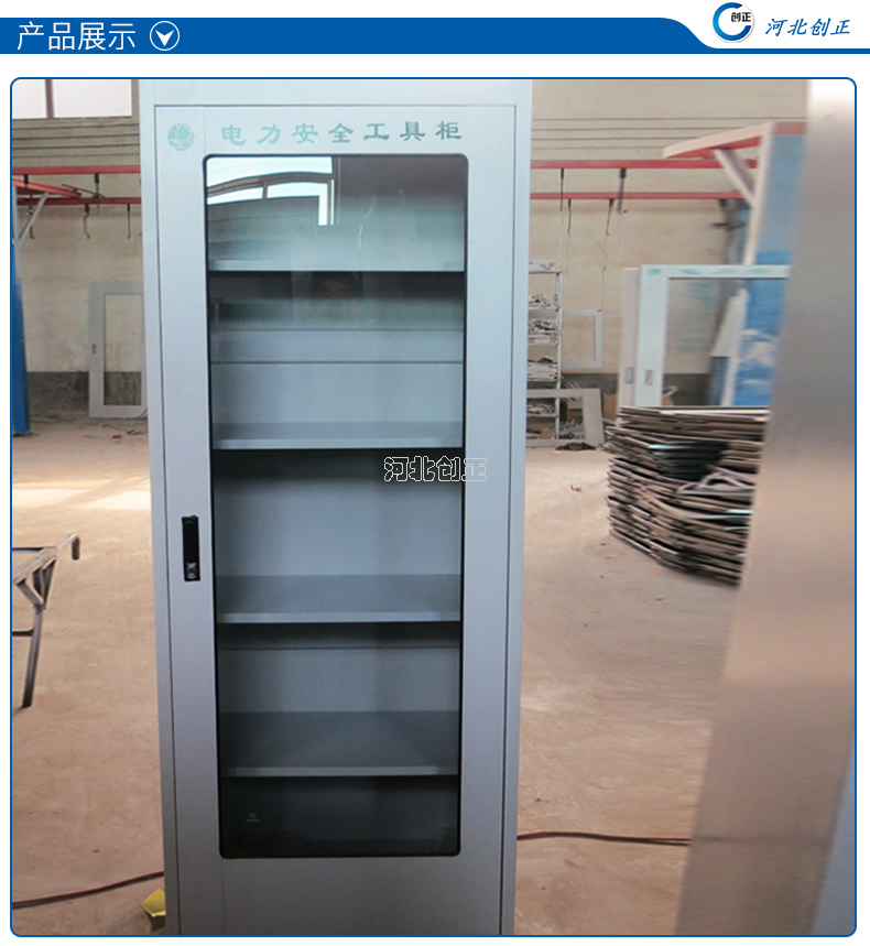 1、柜體是冷軋鋼板卷壓成型,厚度有1.0mm1.2mm1.5mm供選擇。柜體表面采用靜電防腐噴塑工藝,顏色為駝灰色,柜門裝有通體透明鋼化玻璃,透過玻璃可以看到分類有序的工器具。